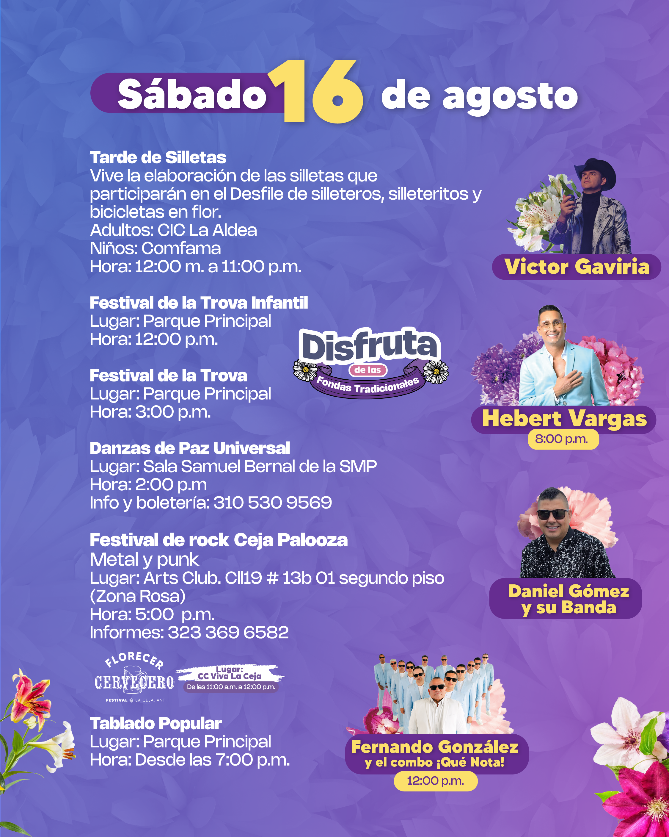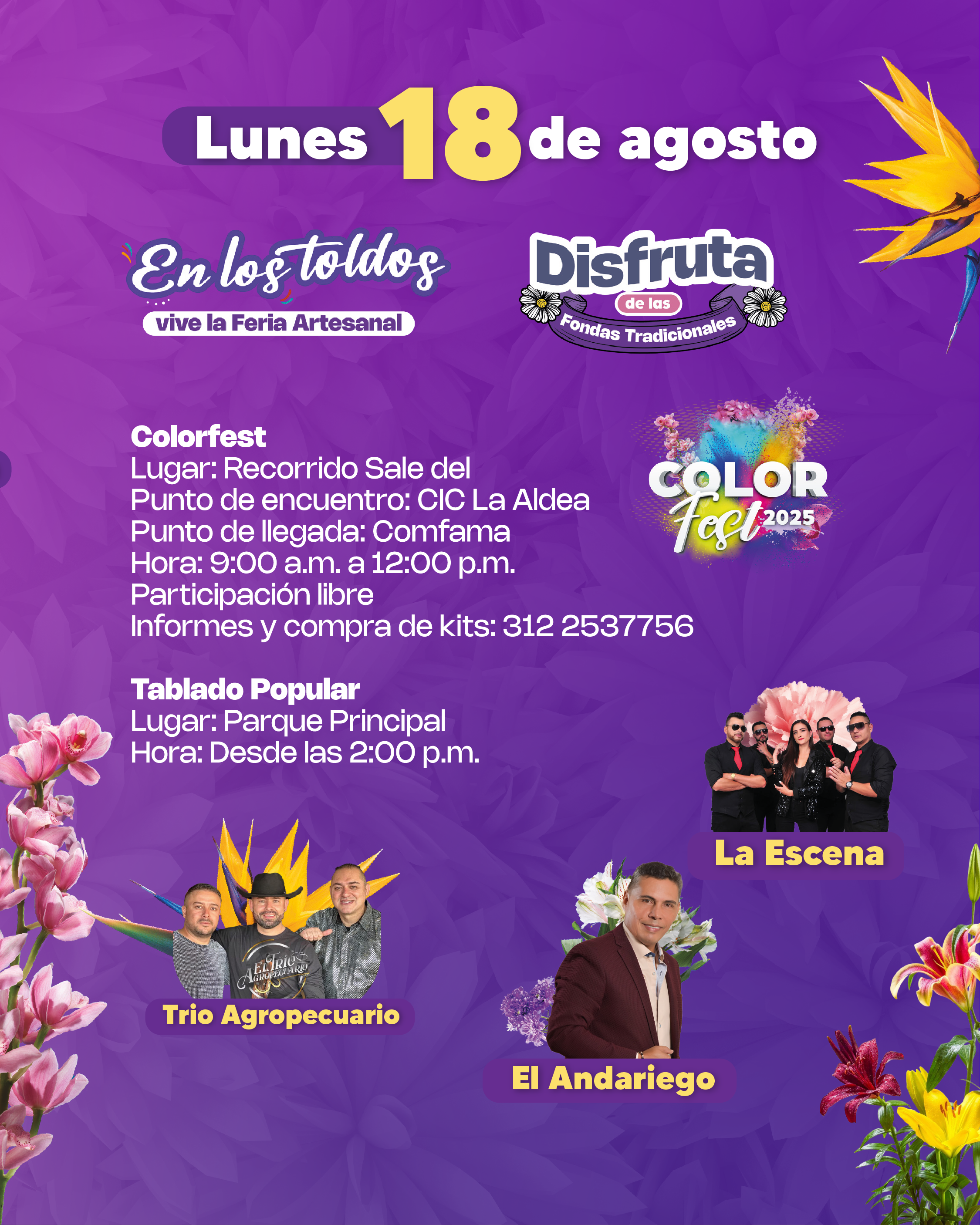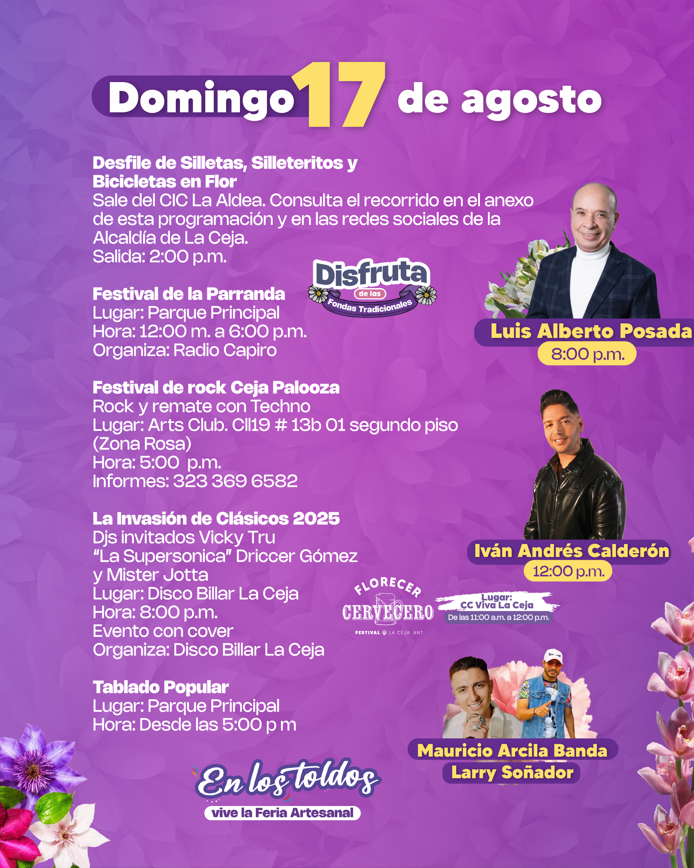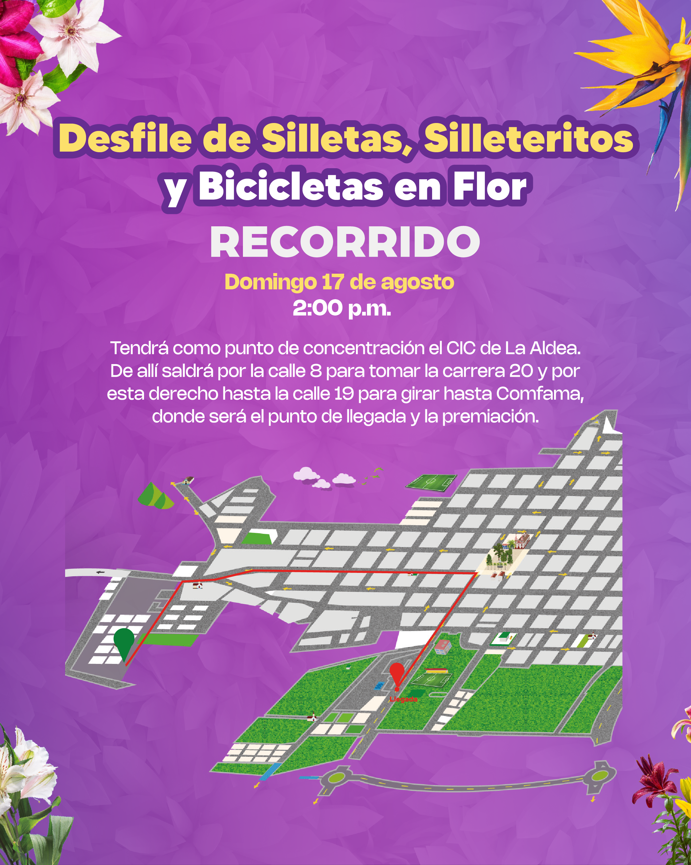 El domingo 17 se realizará el tradicional Desfile de Silleteros, Silleteritos y Bicicletas en Flor, que partirá desde el Centro de Integración Ciudadana de La Aldea, continuará por la carrera 20 hasta la calle 19 y girará hacia Comfama, donde se llevará a cabo la premiación a las mejores comparsas y silletas.
