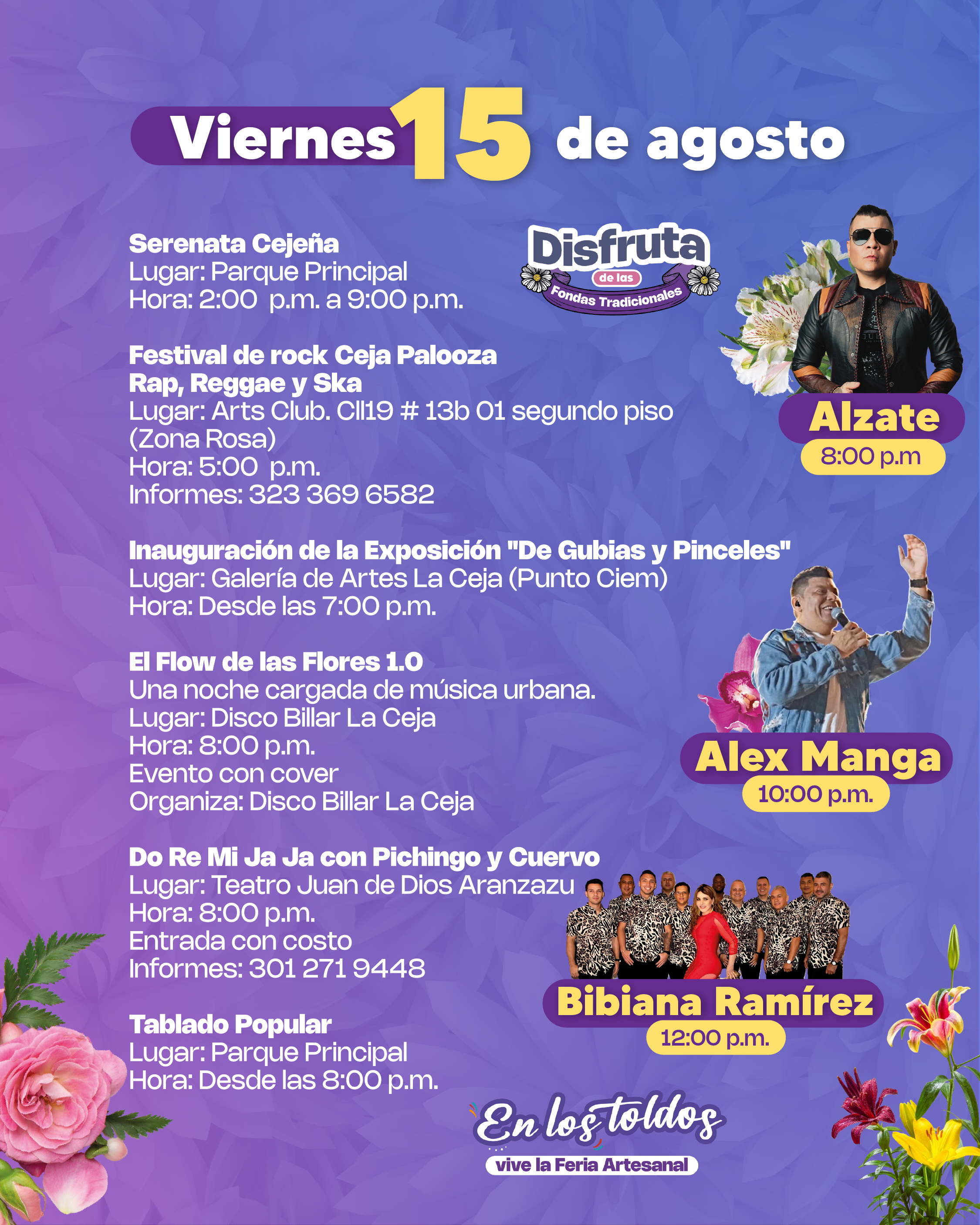 Más de 600 artistas locales, entre los que se incluyen Fredy Bermúdez, Magangué Orquesta, el Trío Agropecuario, Orquesta Cañaveral, Terracota, Beera, Dylan, La Ceja a la Plancha, Estudiantina La Alborada del Tambo, ReDanCe, entre muchos más, se presentarán en el tablado principal y otros espacios alternativos, durante los 10 días de celebración. Muchos de ellos respondieron a la convocatoria pública, permitiendo que la programación se llene de voces, ritmos y expresiones cejeñas.