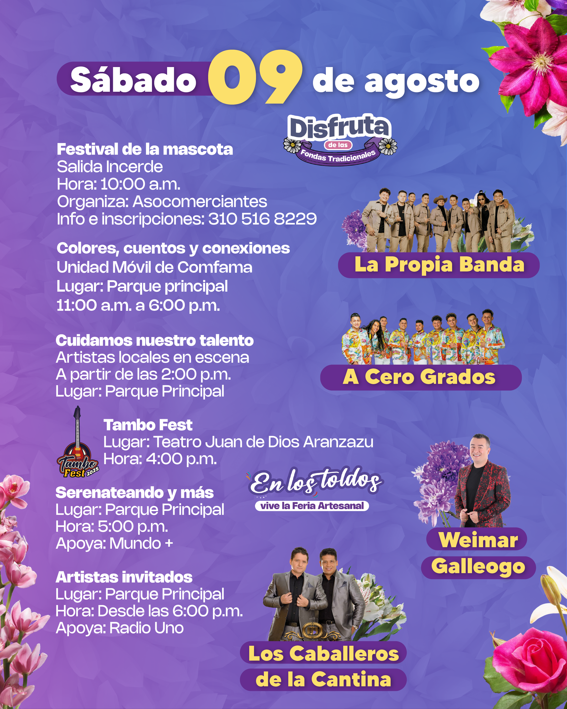 Más de 600 artistas locales, entre los que se incluyen Fredy Bermúdez, Magangué Orquesta, el Trío Agropecuario, Orquesta Cañaveral, Terracota, Beera, Dylan, La Ceja a la Plancha, Estudiantina La Alborada del Tambo, ReDanCe, entre muchos más, se presentarán en el tablado principal y otros espacios alternativos, durante los 10 días de celebración. Muchos de ellos respondieron a la convocatoria pública, permitiendo que la programación se llene de voces, ritmos y expresiones cejeñas.